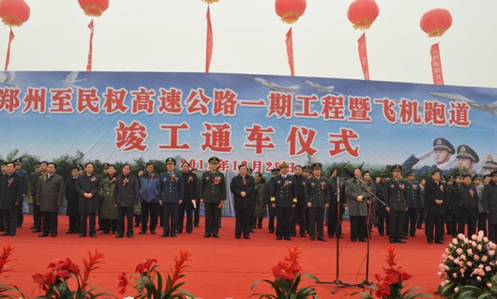 12月29日,由中原高速承建的河南省第一条交通战备高速公路项目,郑州至民权高速公路一期工程暨飞机跑道建成通车。河南省副省长张大卫、济南军区副参谋长张祁斌、省交通运输厅厅长孙廷喜,副厅长李和平、郭晓明,省交通运输厅交战办主任苗章栓,集团领导宋春雷、杨文礼,济南军区、省发改委、环保厅、高速交警总队、重点办、省军区、郑州开封两市领导,省交通运输厅厅属处室、单位负责人,沿线县市区负责同志参加仪式。张大卫副省长下达通车令。