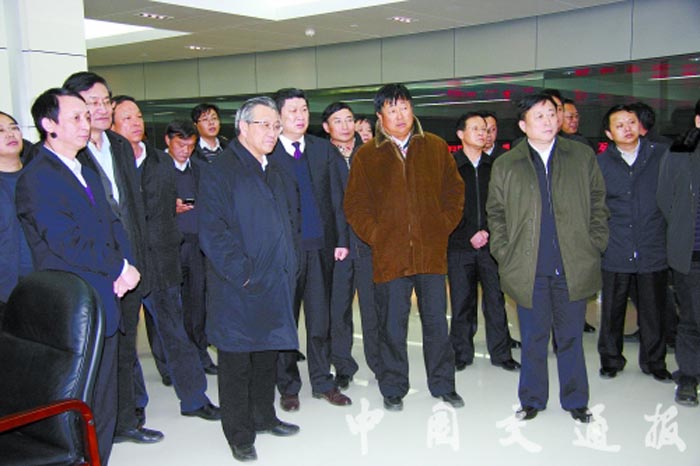 图为李盛霖(前左一)、张大卫(前右一)在河南省高速公路应急指挥中心考察。本报记者 刘兴增 摄