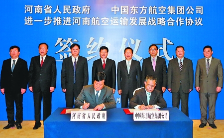 9月12日下午,河南省人民政府、中国东方航空集团公司进一步推进河南航空运输发展战略合作协议签约仪式在郑州举行