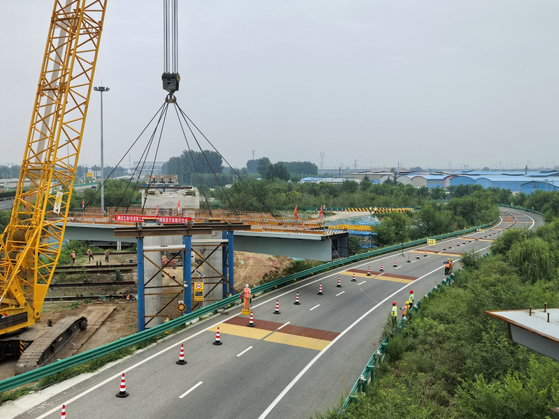 此次吊装作业位于曲沟互通核心区域,主跨长度50米,作业需跨越正在运营的高速匝道,对吊装精度、安全控制和现场协同要求极高。为确保吊装顺利实施,项目公司明确责任分工,提前组织多轮技术论证,优化吊装方案。在吊装过程中,现场实行统一指挥,统筹协调设备调度、安全布控及流程衔接,保障各环节有序推进,确保施工符合规范要求。高速交警、路政部门全程提供交通保障,通过科学导流及设置安全警示区域,有效兼顾匝道通行安全与吊装作业需求。
