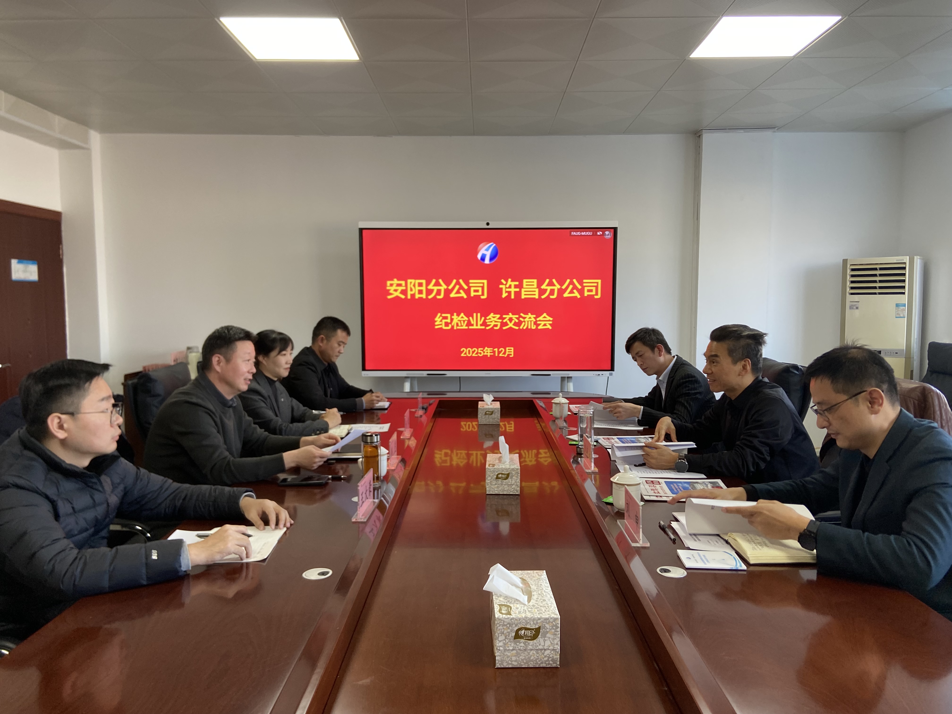 2025年12月3日下午,许昌分公司纪委书记刘艳超一行到访安阳分公司,与安阳分公司纪委共同开展纪检业务交流。安阳分公司纪委书记韩斐主持会议,双方纪检监察部门相关同志参加会议。