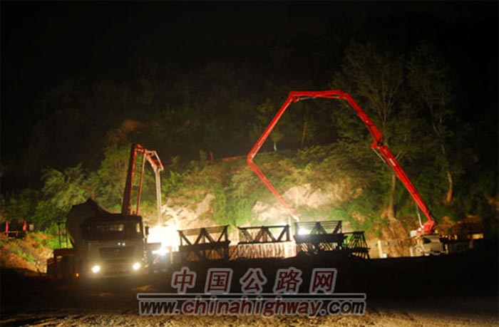 位于嵩栾高速土建一标的栗子坪特大桥堪称全线控制性工程,其两座承台分别于8月14日19时、8月20日14时浇筑完毕,共浇筑混凝土约2700立方米。承担该桥施工任务的河南省公路工程局集团二公司,发扬河南交通铁军精神,加大投入,克难攻坚,终于如期完成了业主公司制定的节点目标任务。经业主、监理方面考核,决定兑现节点奖金10万元。图为19日晚间2号承台混凝土浇筑现场。(8月22日,中国公路网)
