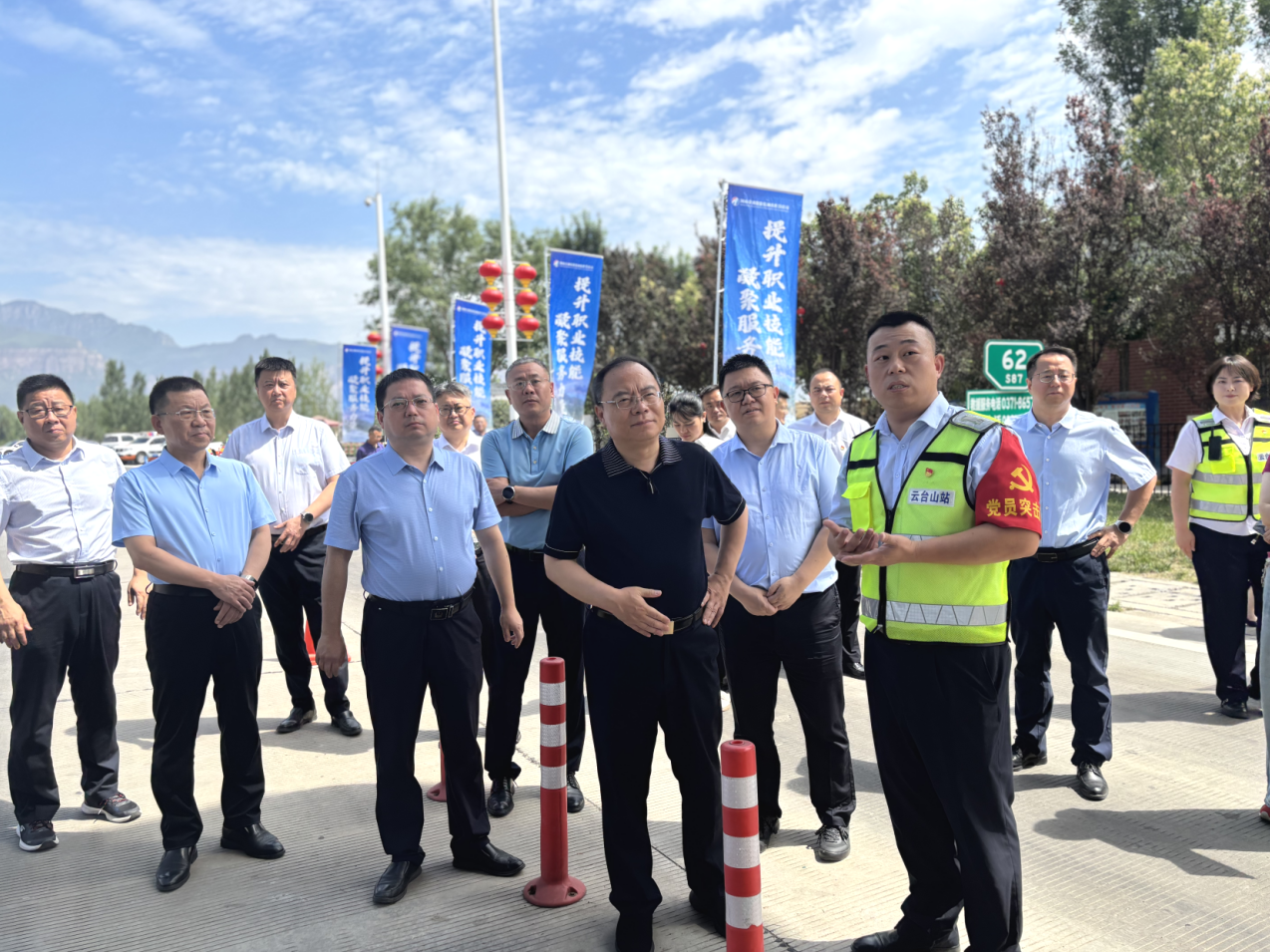 在云台山收费站,关健总经理实地察看无人收发卡机器人车道、共享停车区、“三夏”便民服务台、交旅融合主题半开放式综合服务站区创建、“五星”党支部创建,强调:一是强化党建示范引领,以高质量党建引领高效能治理,推动运营管理提质增效。二是强化保通保畅意识,创新车道布局,探索使用潮汐车道,切实缓解旅游高峰期路段拥堵。三是提高服务能力,依托交旅融合主题半开放式综合服务站区创建,优化服务流程,完善便民设施,打造云台山收费站交旅融合站区服务品牌。四是强化安全防汛意识,立足“防大汛、抗大灾、抢大险”,全力做好汛期暑期安全生产重大风险隐患排查整治,确保安全度汛。